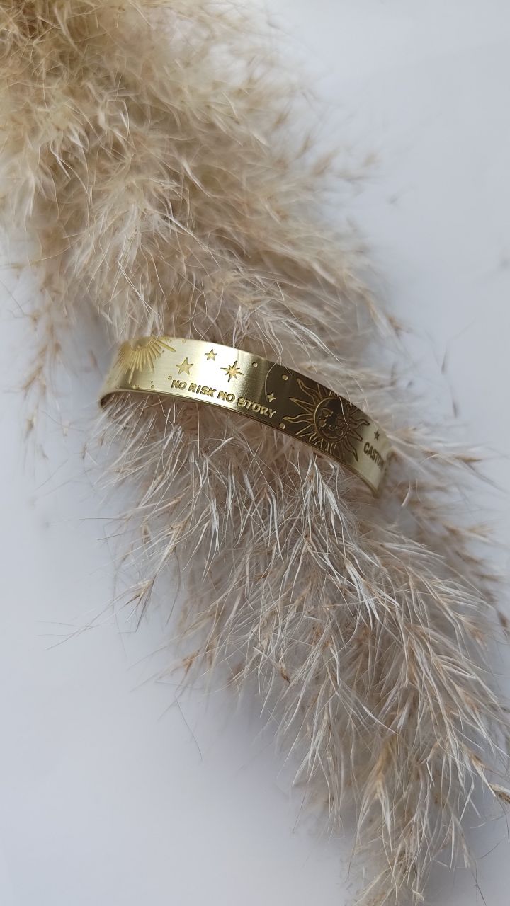 Delikatny motyw słońca symbolizuje energię, wewnętrzną siłę i powrót do siebie. A umieszczony na bransoletce napis „no risk no story” przypomina o odwadze – o tym, że życie dzieje się wtedy, gdy decydujesz się zrobić krok, nawet jeśli nie masz pewności.